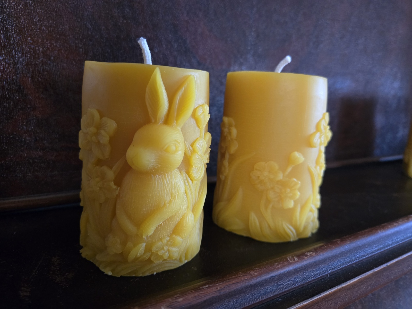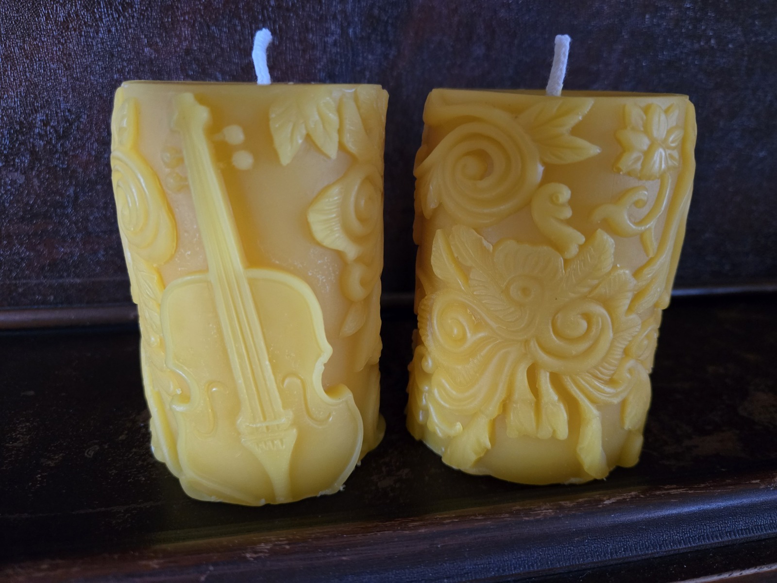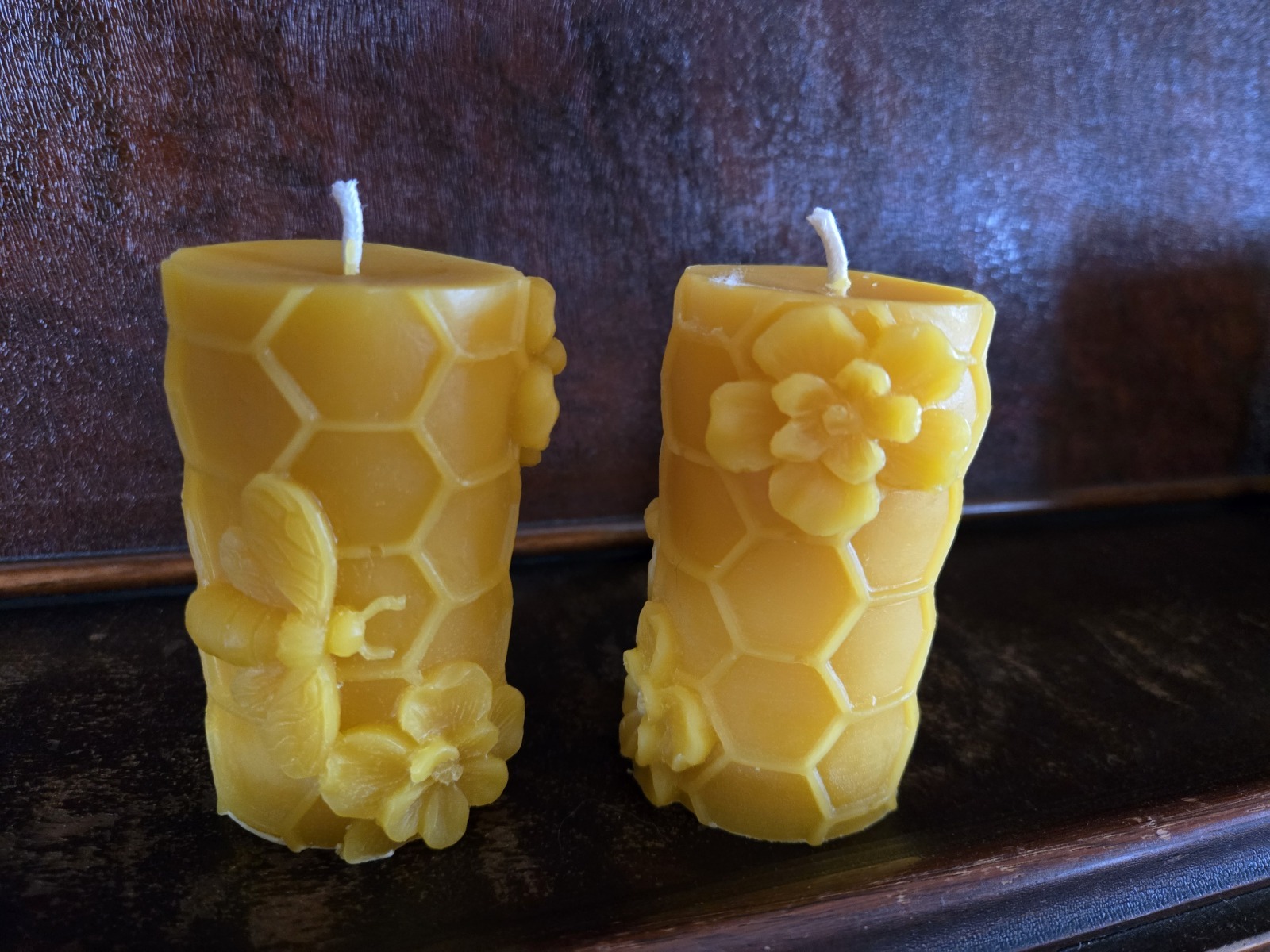 I offer a large variety of pure beeswax candles made using local beeswax and cotton wicks. Everything from pillars in multiple shapes, sizes, and patterns, to tapers, votives, and tealights. My specialty and top selling candles are painted with organic cinnamon. This provides a beautiful rustic look and faint cinnamon smell.